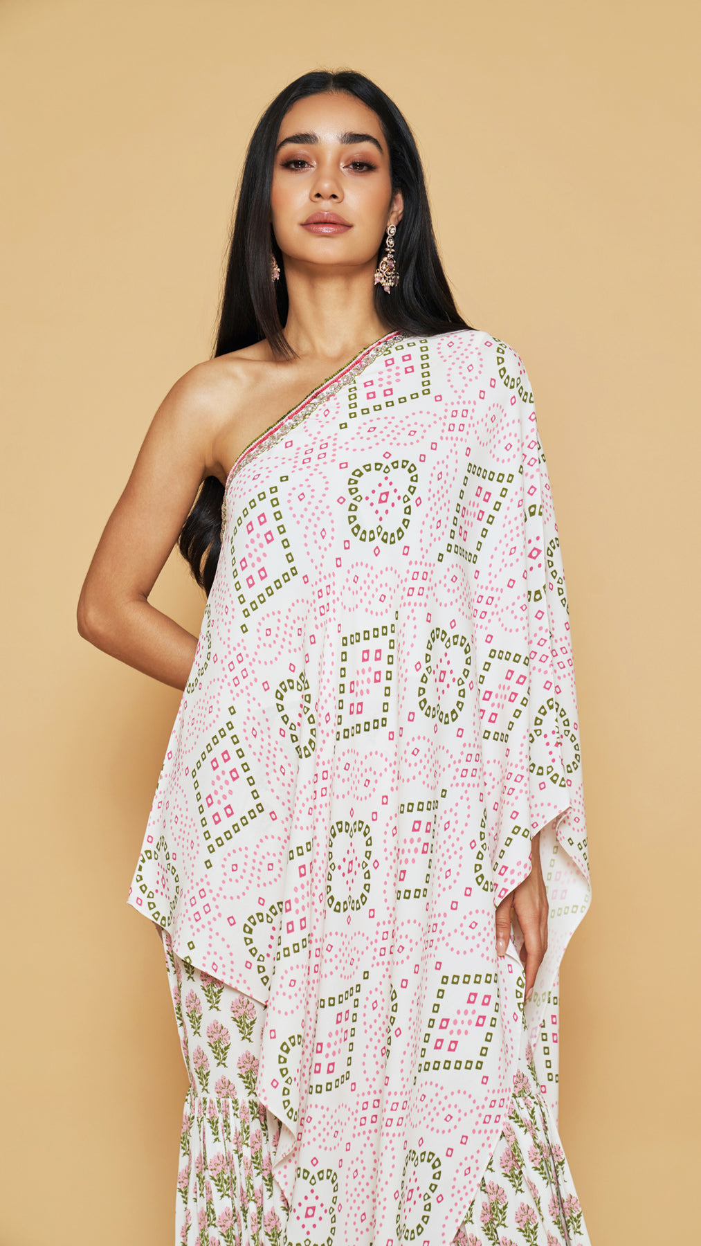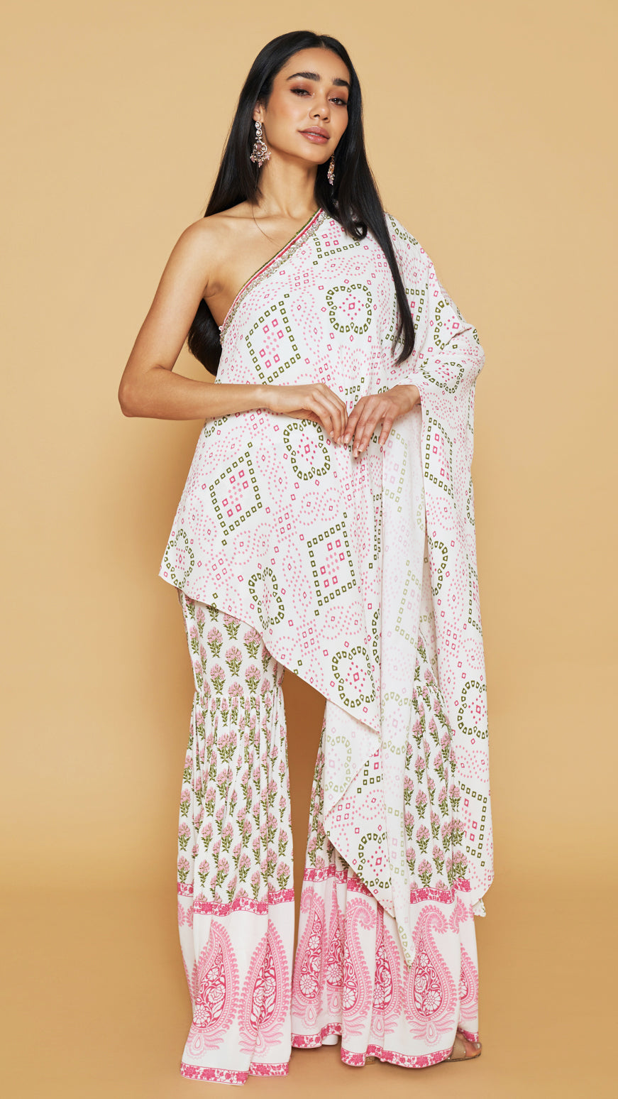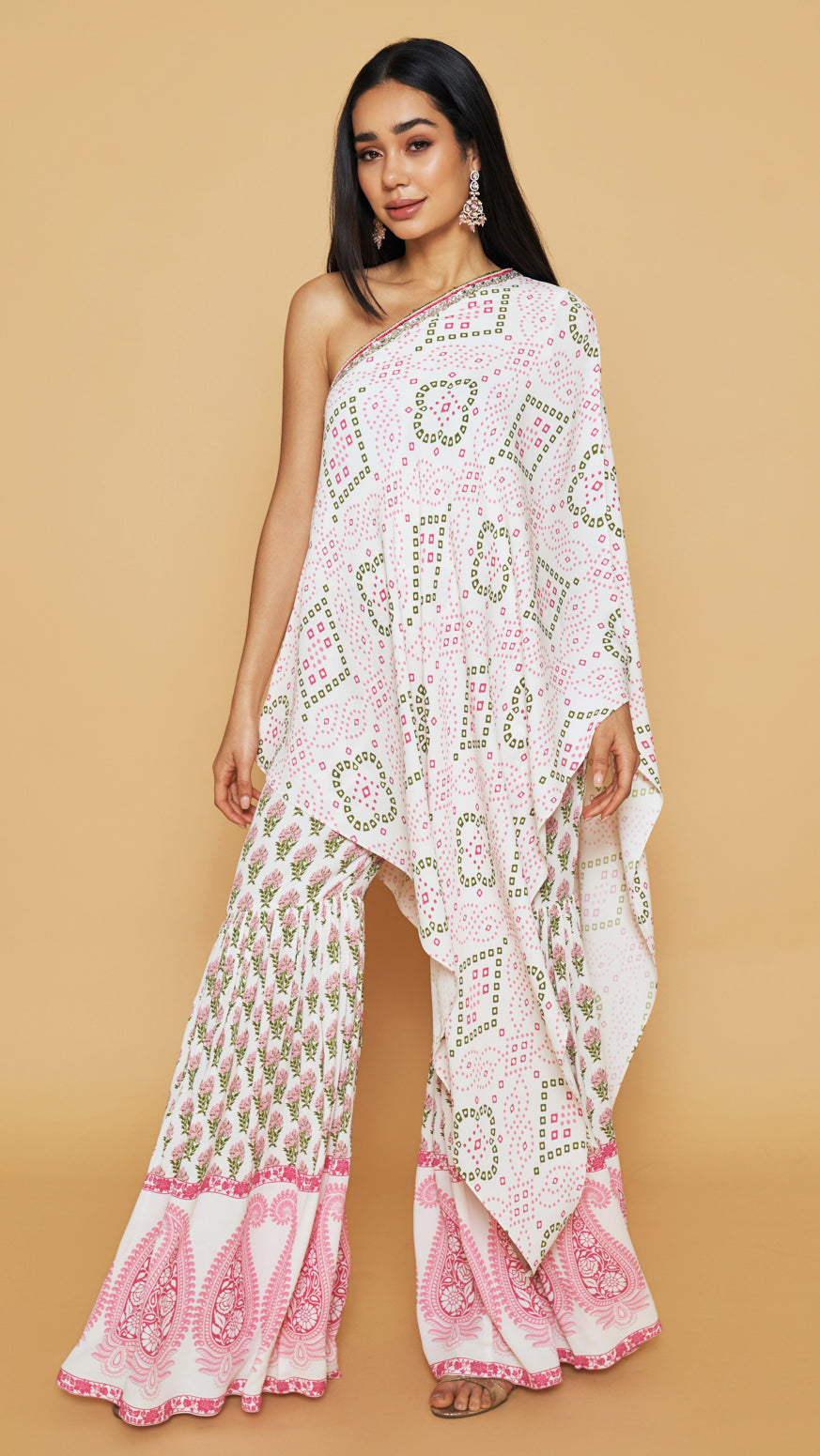 Pink & green bandhani printed one shoulder tunic with an embellished neckline paired with sharara styled pants.