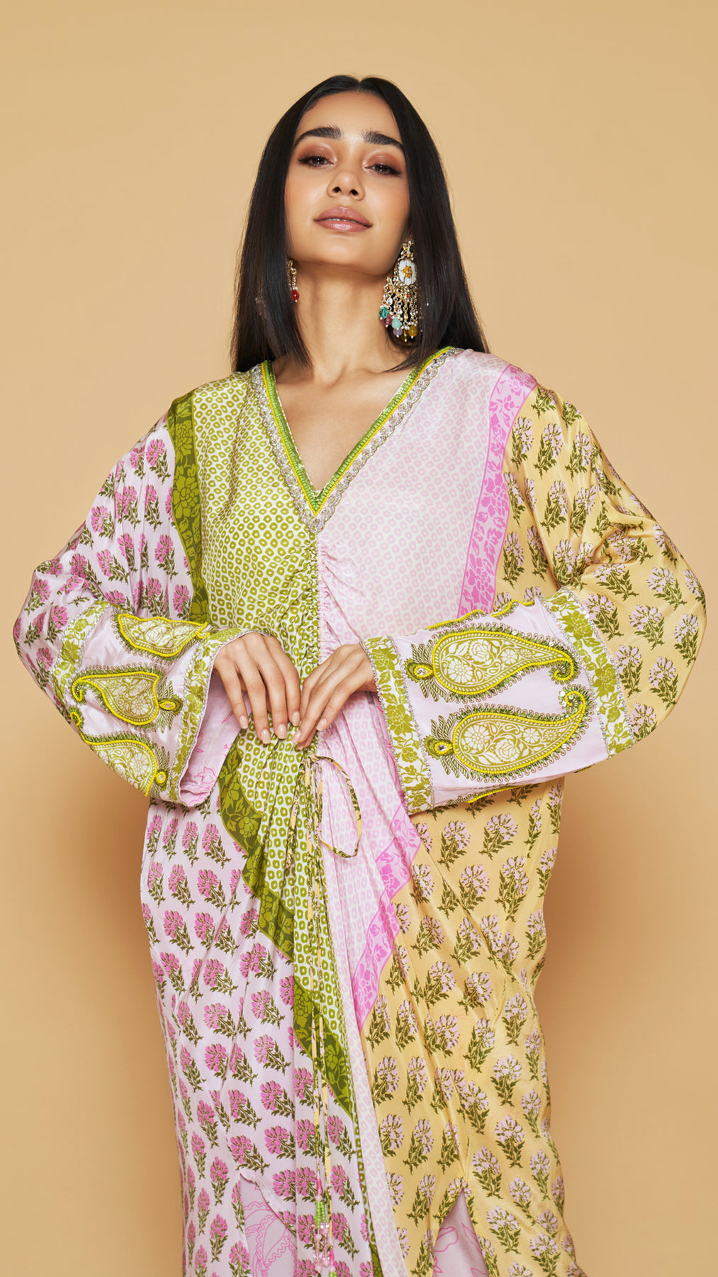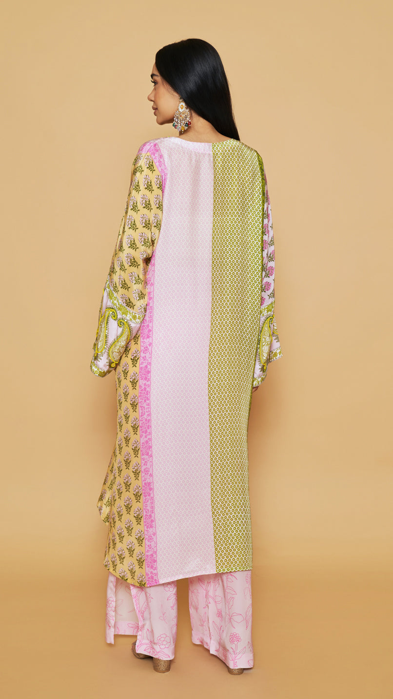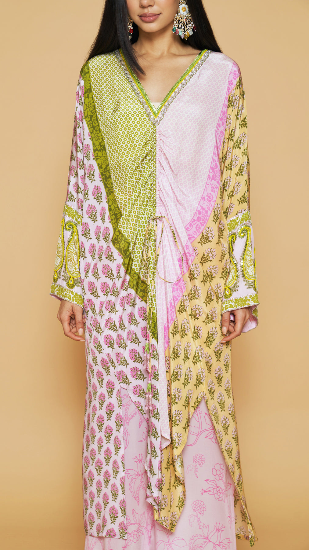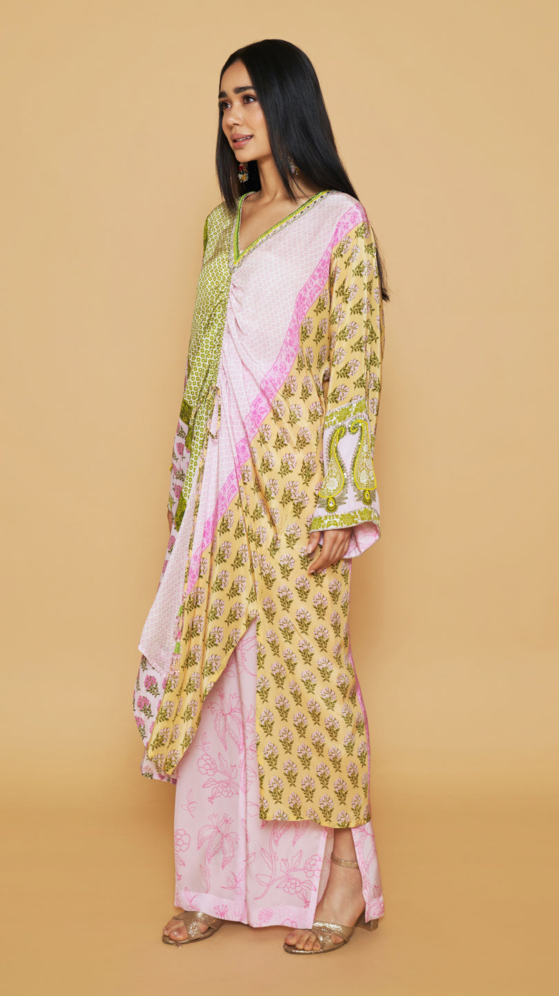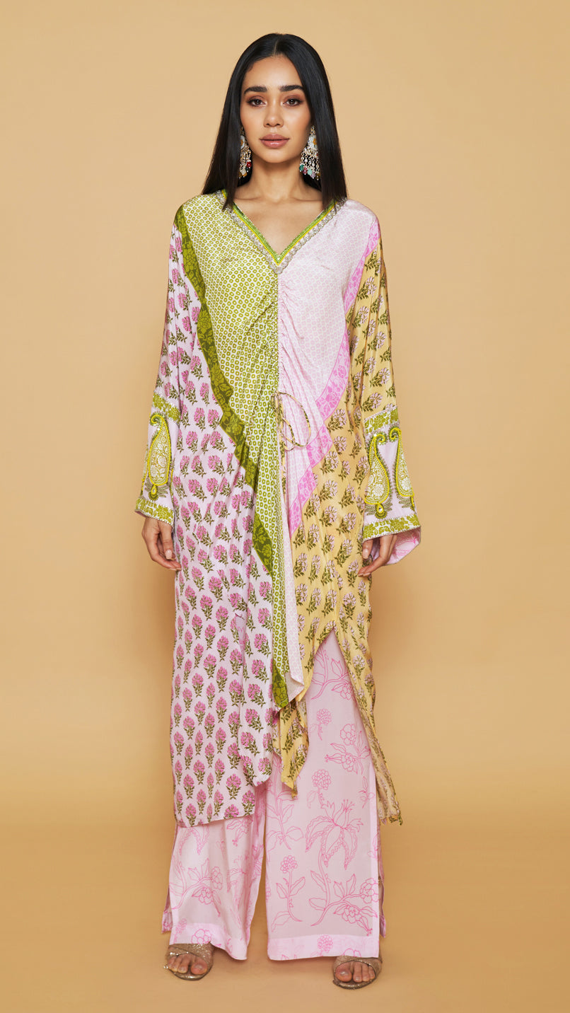 Green, yellow and pink center front drawstring kaftan with tassels and an embellished neckline and sleeves, paired with a straight style side slit pants.