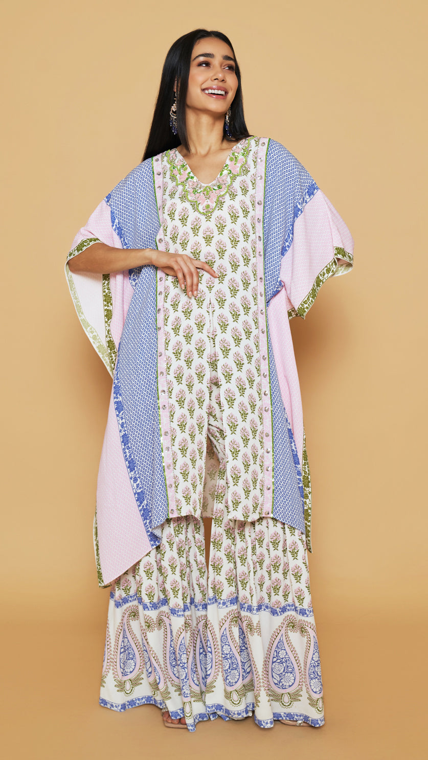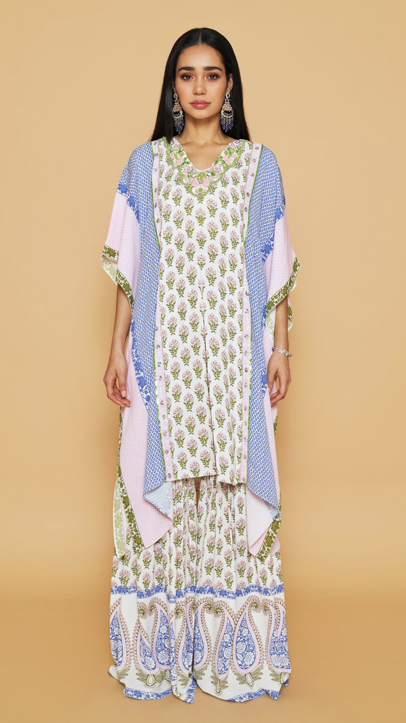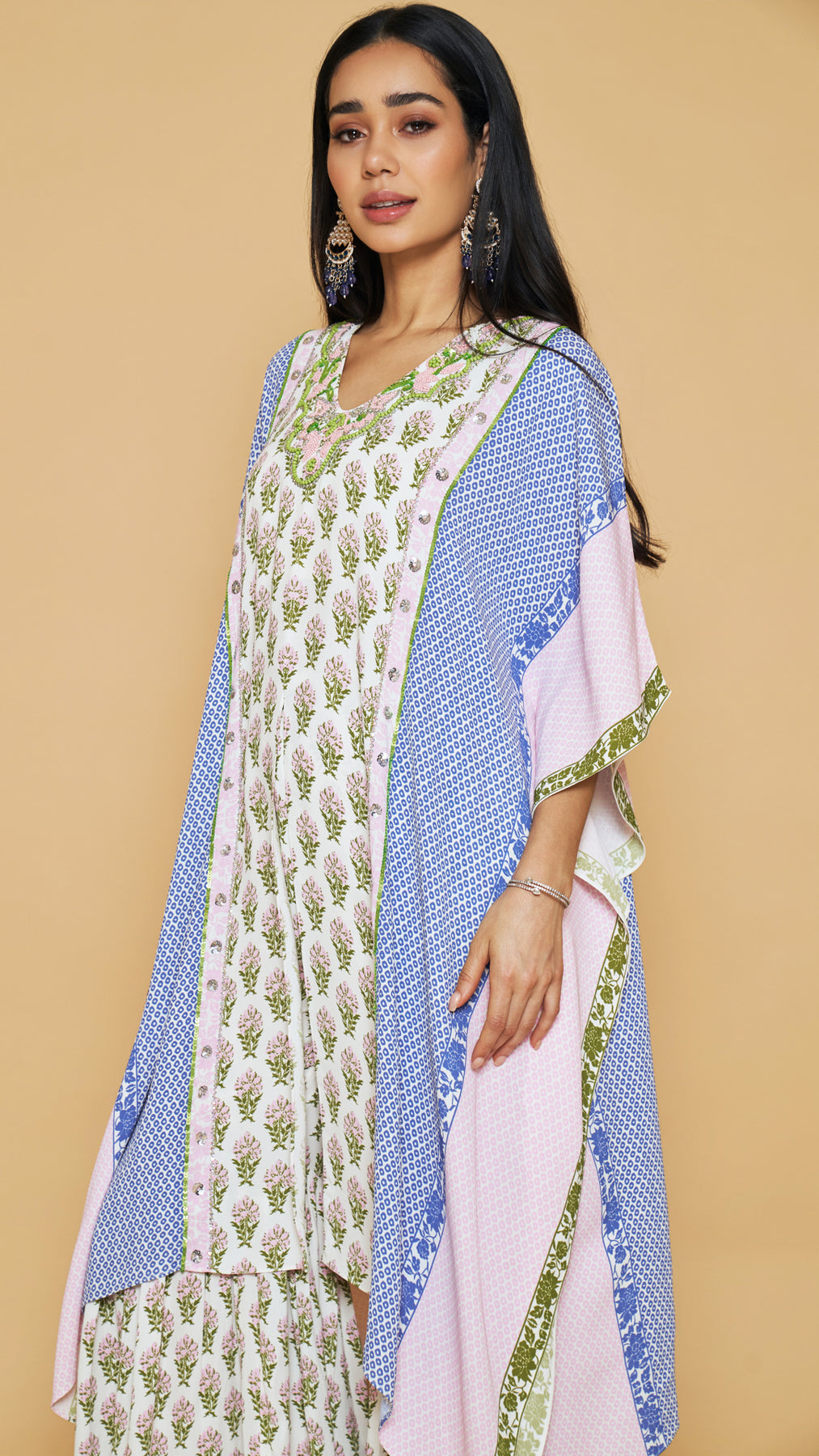 Blue and ivory floral printed kaftan with an embellished neckline and a centre front slit detail paired with sharara styled pants.