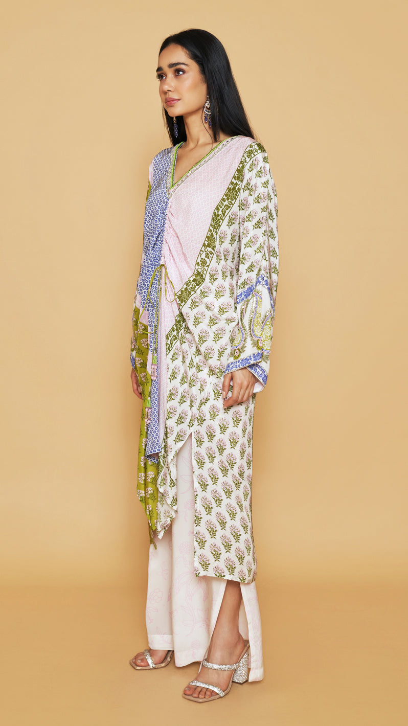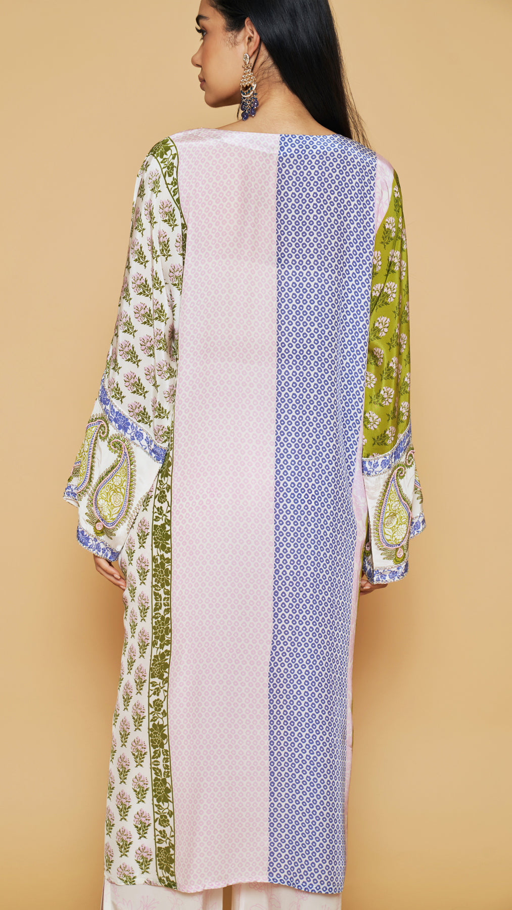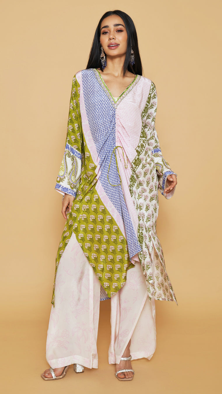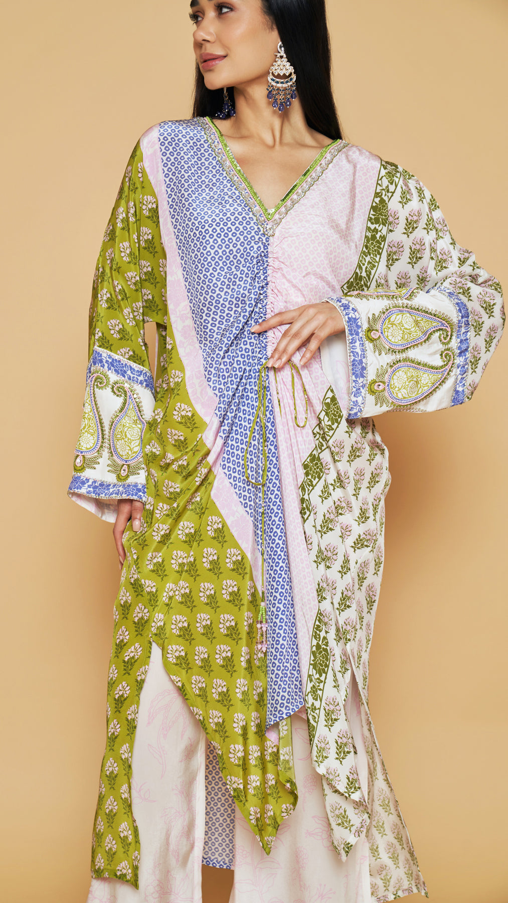 Blue , green and pink center front drawstring kaftan with tassels and an embellished neckline and sleeves, paired with a straight style side slit pants.