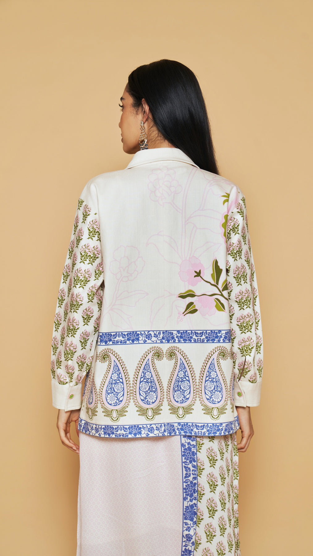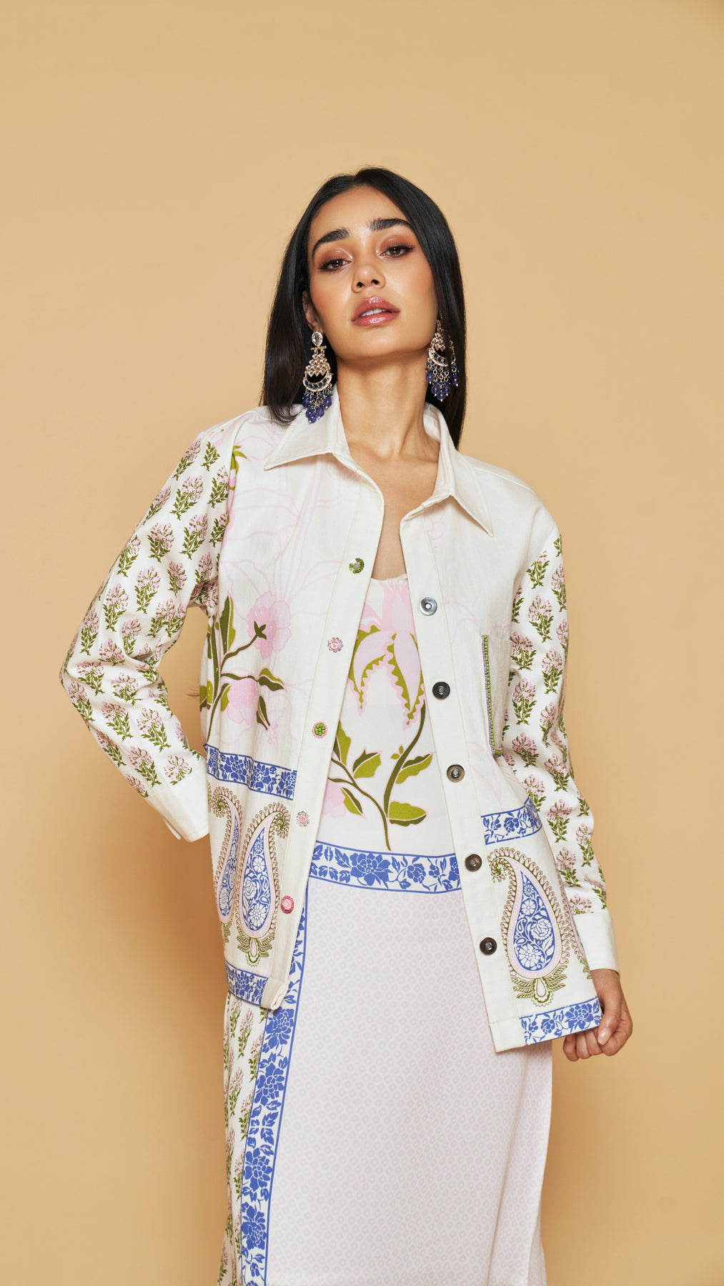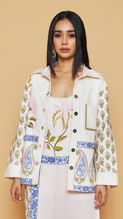 Ivory & blue floral printed cotton twill jacket with a beaded pocket detailing and magnetic buttons.